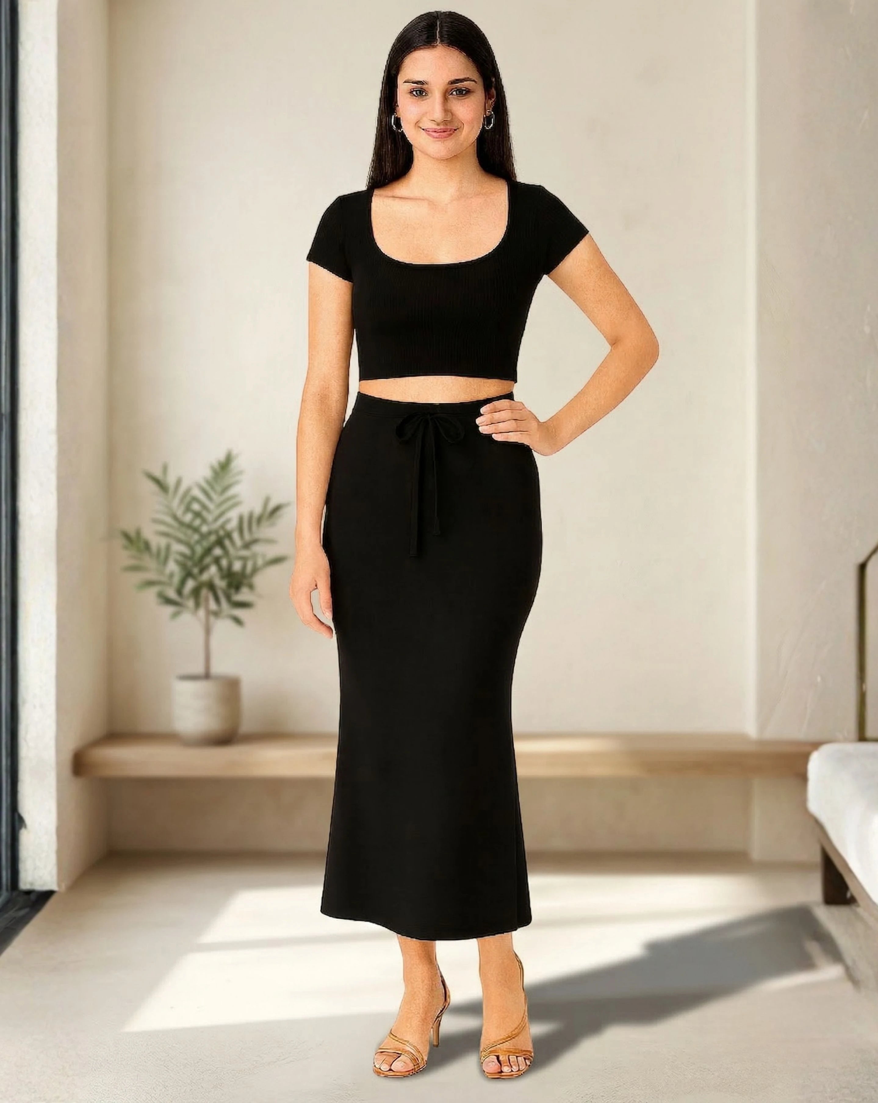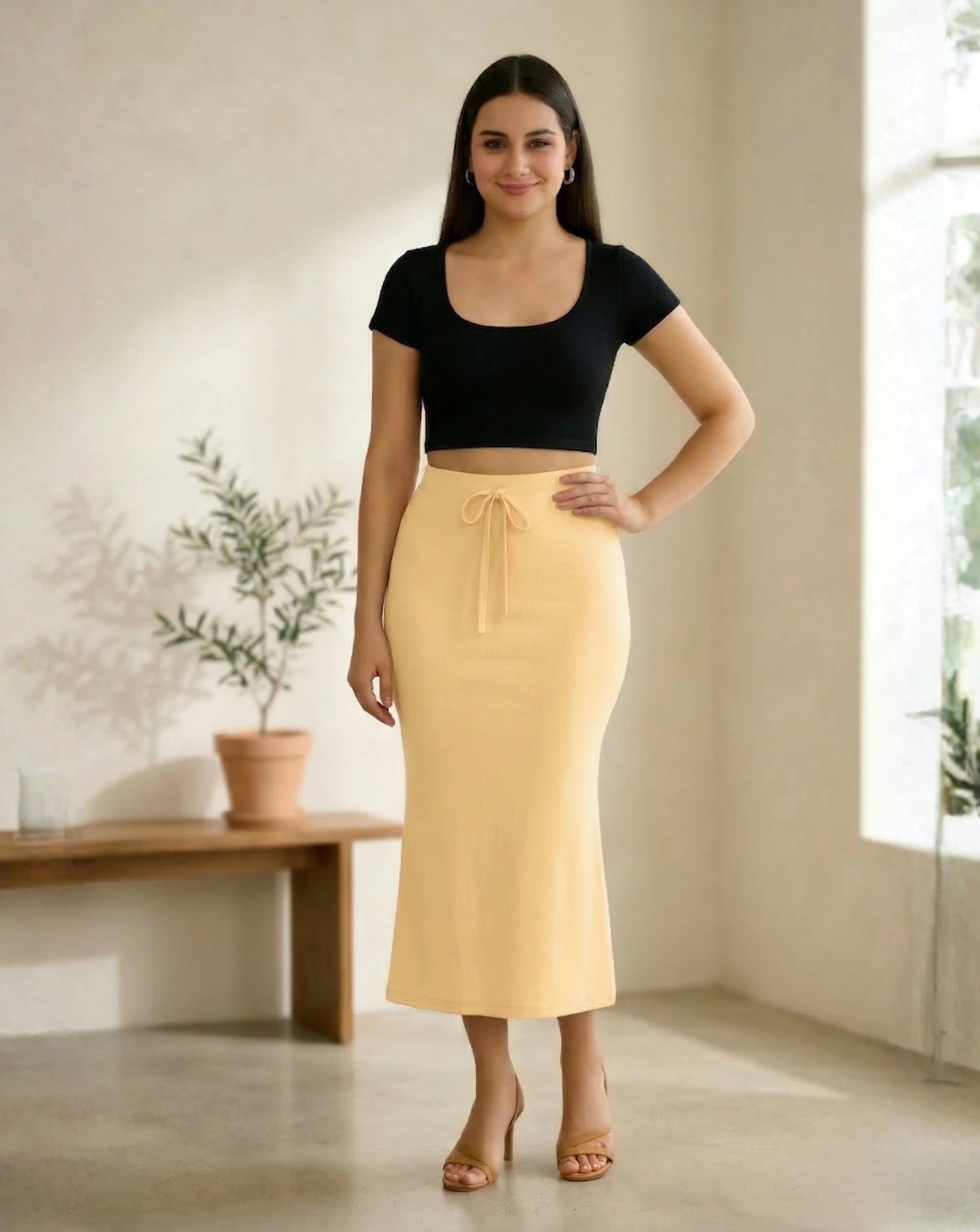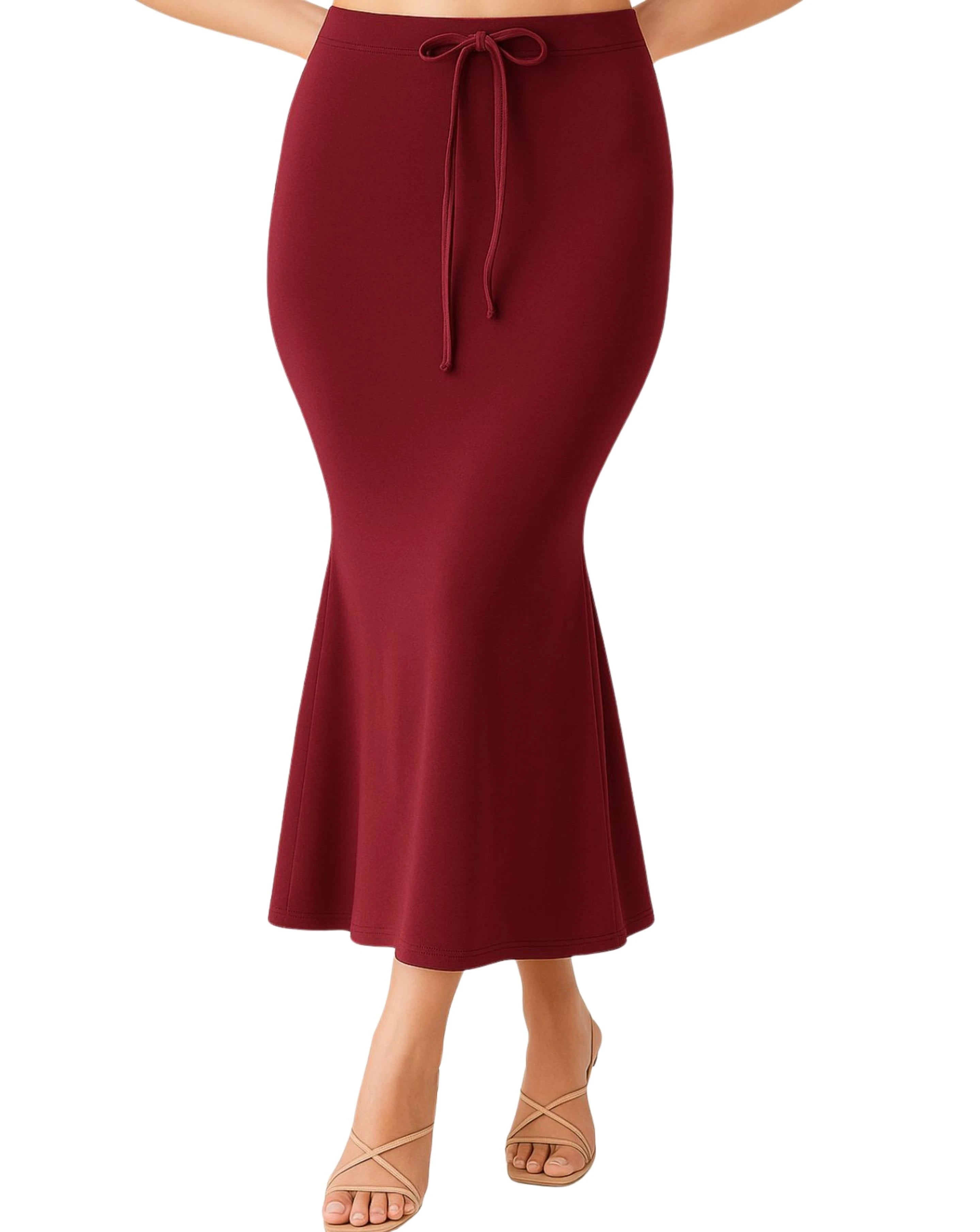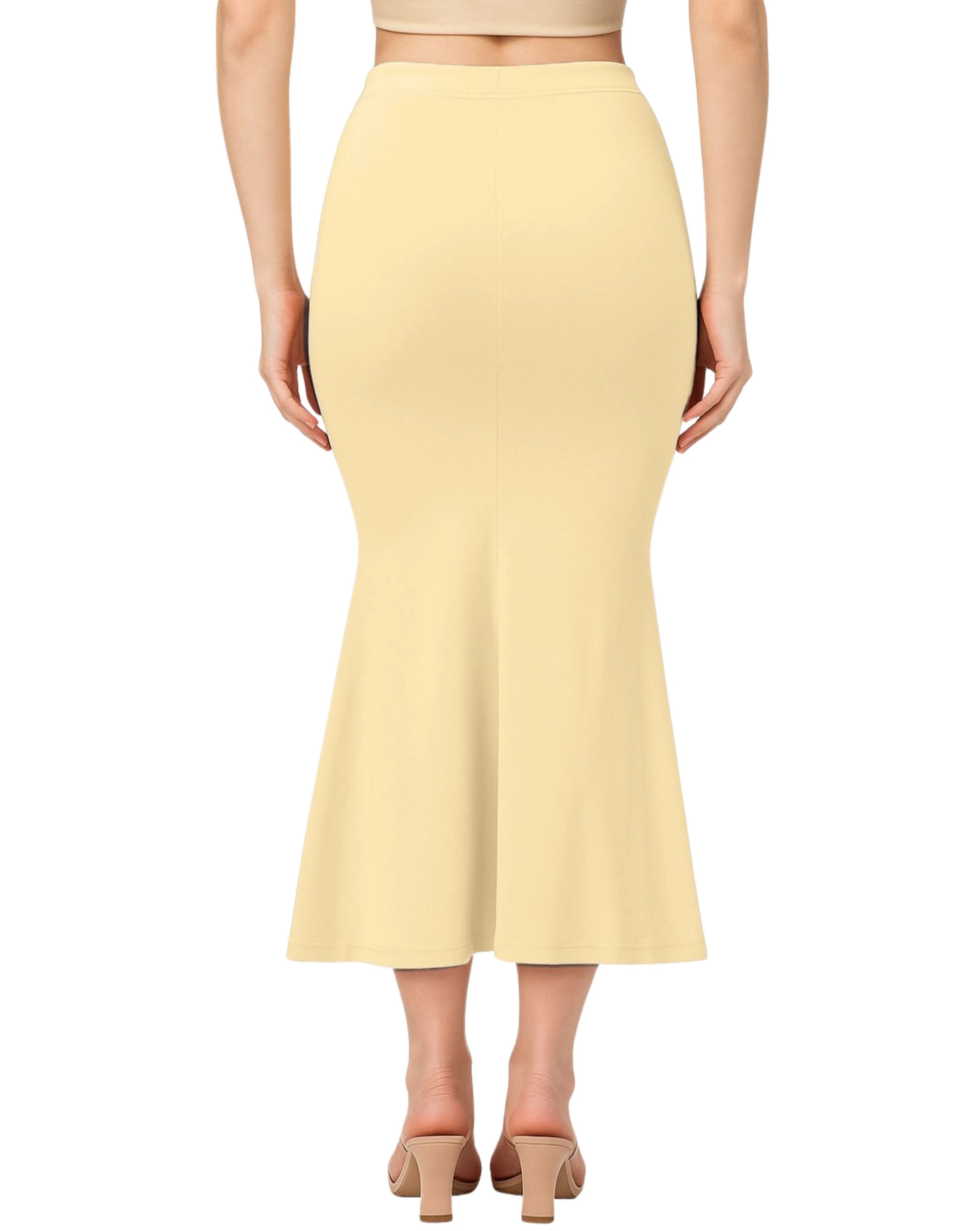 Premium quality saree shapewear petticoat crafted with 4-way stretch fabric (polyester, lycra/spandex blend) that provides a perfect body-hugging fit and smooth silhouette. The fabric is soft, breathable, skin-friendly, and non-allergic, ensuring all-day comfort.